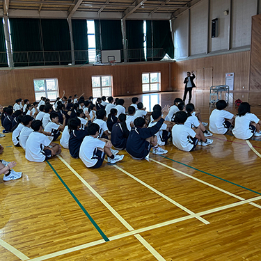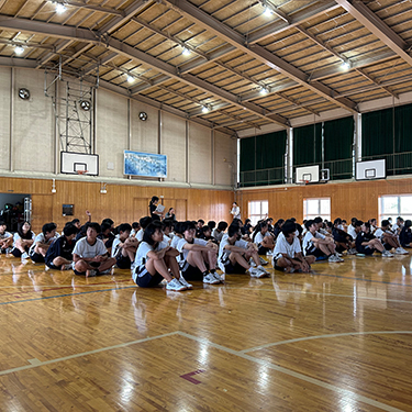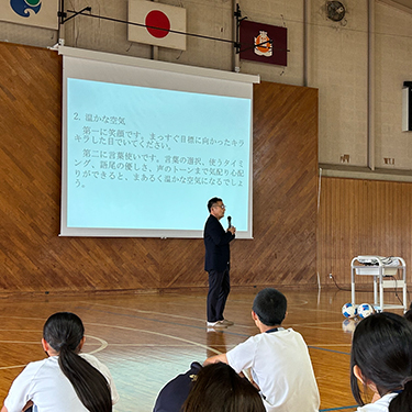 サッカー部の部長・副部長のお手伝いで講演が盛り上がります! サッカーを通して気配り・五感で行動することの話をしました。
