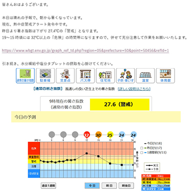 本日の暑さ指数(WBGT値)を知らせる社内メール