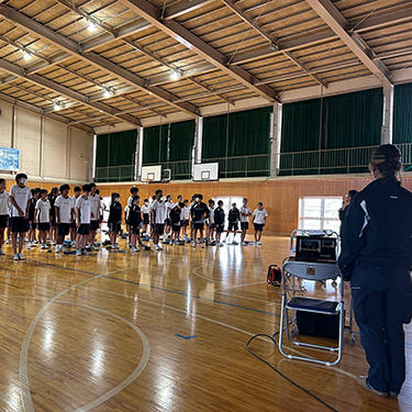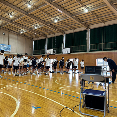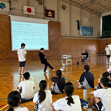 サッカー部の部長・副部長のお手伝いで講演が盛り上がります! サッカーを通して気配り・五感で行動することの話をしました。